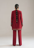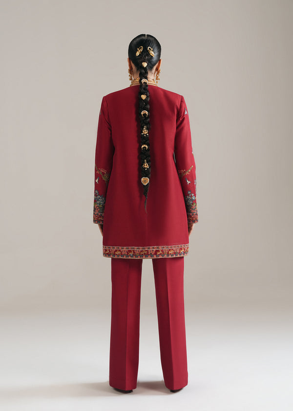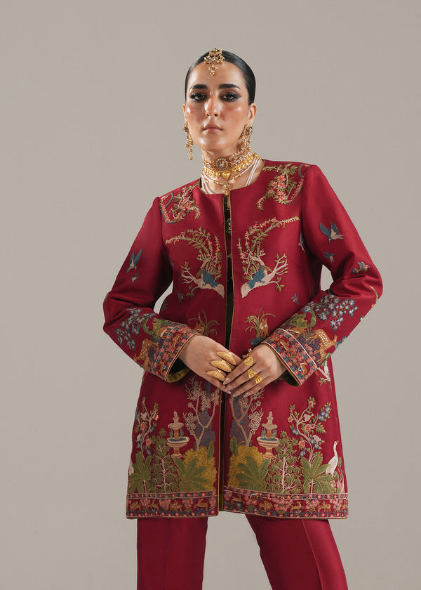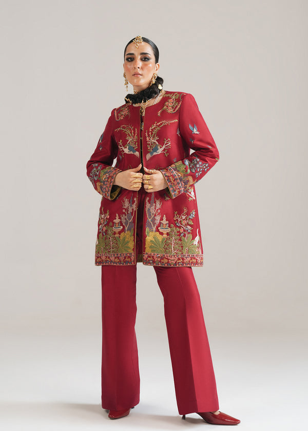 This red modern short jacket is a true symbol of today’s fashion era, where heritage meets innovation. Crafted from pure raw silk, it radiates luxury and sophistication. The jacket is adorned with intricate Shikar gah embroidery, reimagined with a modern aesthetic that celebrates timeless craftsmanship. Every stitch tells a story of tradition, while the bold silhouette reflects the passion and pure love for contemporary fashion. A perfect blend of elegance and artistry, this jacket is more than just an outfit—it’s a statement of style.
