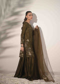 This striking olive ensemble is crafted on luxurious Italian fabric, exuding a refined and elevated vibe. The beautifully tailored shirt features intricate hand embellishments that add depth and artisanal charm. Paired with fluid palazzo pants and finished with a delicately scalloped dupatta, this look blends modern grace with timeless luxury perfect for a statement festive appearance.