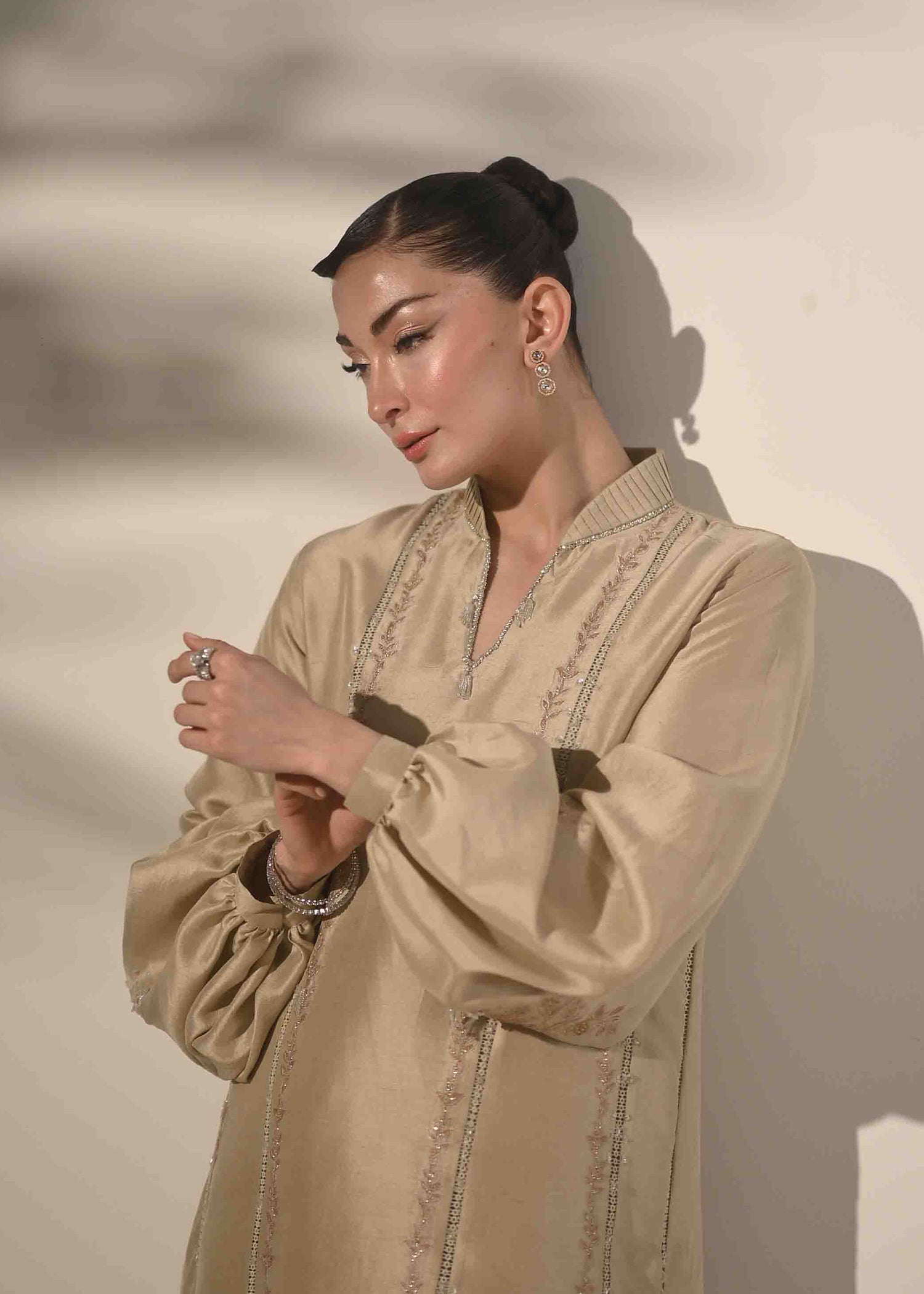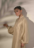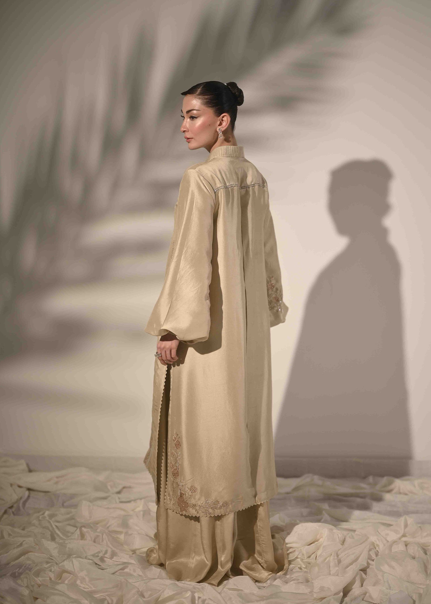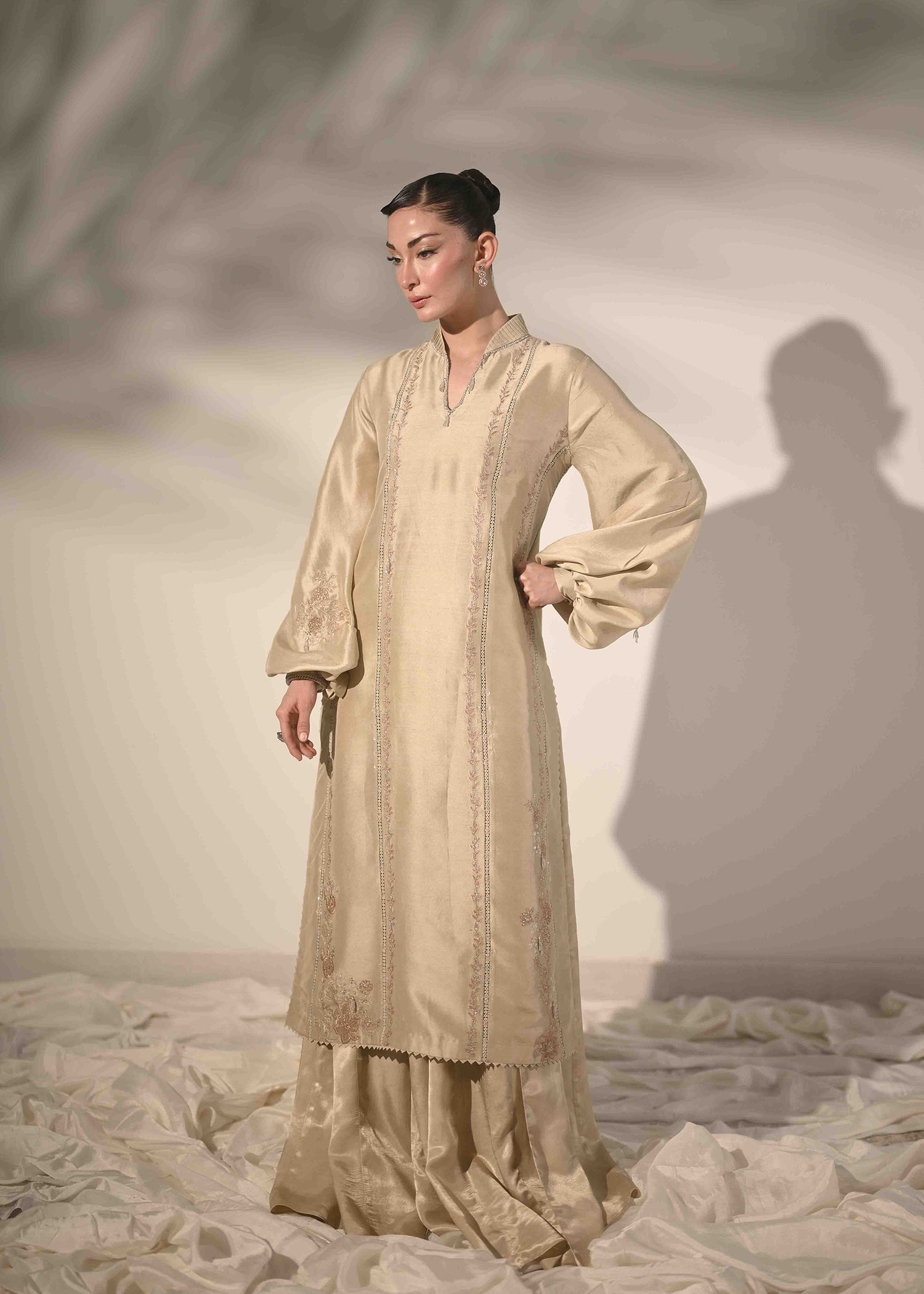 This ensemble is crafted in pure raw silk, reflecting timeless refinement and festive appeal. The elongated shirt silhouette is detailed with intricate interlacing accents, enhanced by delicate applique embroidery for a finely crafted finish. Soft buff sleeves bring a modern balance, while the hand-embellished neckline adds subtle festive richness. Paired with a fluid pure rot silk palazzo, the look is completed with graceful movement and understated luxury ideal for refined Eid celebrations.