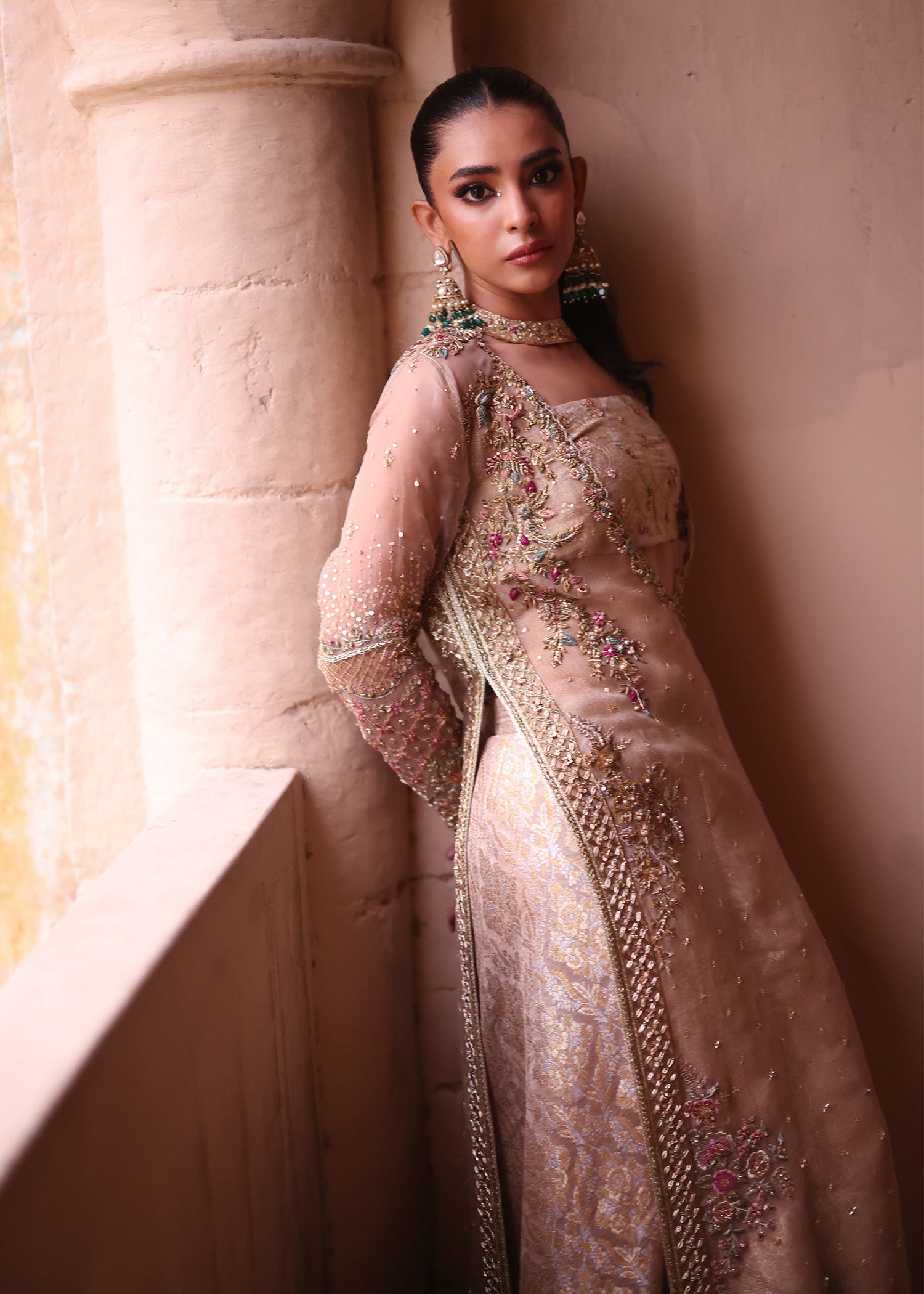 The long shirt in pure organza Mysore combines traditional craftsmanship with modern elegance. Its beige hue evokes a sunlit glow, while intricate multi-colored handwork showcases artistic detail. The modern neckline adds sophistication. Paired with luxurious Palazzos in pure Atlas fabric, the outfit offers both comfort and style, flowing gracefully to enhance the overall silhouette. The dupatta, crafted from luxurious organza Mysore, features a gradient of three beautiful shades, adding a touch of ethereal elegance and depth to the ensemble.