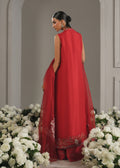 This ruby-red front-open jacket is adorned with intricate floral embroidery in delicate gold and lilac threads, radiating richness and elegance. Layered over a matching bustier, the ensemble highlights masterful craftsmanship and 3D embellishments that reflects traditional artistry and vibrant luxury. Paired with a sheer organza dupatta, it becomes a timeless statement of festive grandeur.