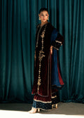 A luxurious maroon velvet long kurta adorned with intricate antique-gold embroidery running symmetrically along the front .The neckline features delicate handwork ,adding a regal touch ,while the teal embellishment cuffs brings a striking contrast to the rich velvet texture paired with a pants with the same contrast teal embellishment border and a crush double shade dupatta with velvet finishings which completes the over all look of the shirt ,perfect for winter weddings and evening celebrations .