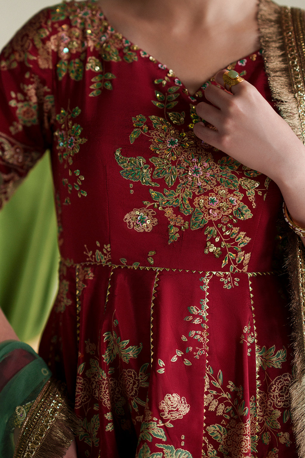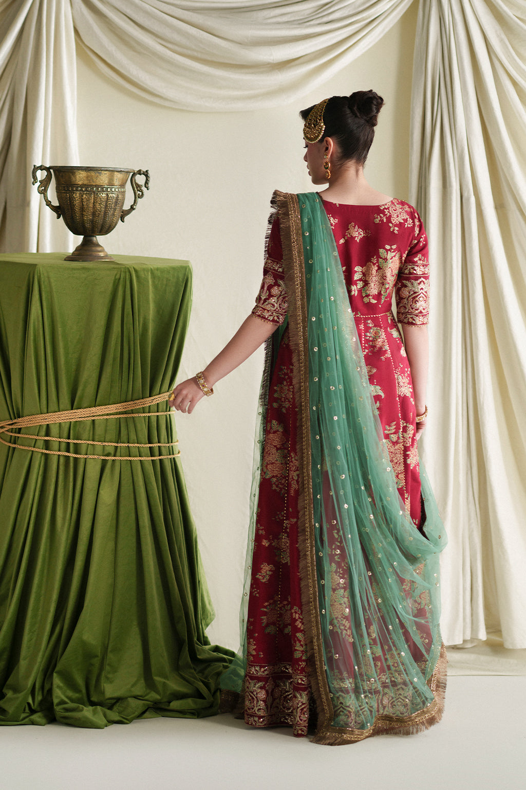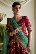 A timeless red screen-printed kalidar crafted in rich silk, enhanced with delicate hand embellishments and an intricately embroidered border. Paired with a contrasting net dupatta and a plain trouser for an elegant, refined look.