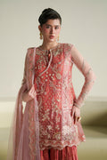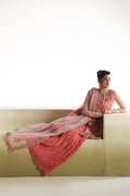 A graceful coral angrakha adorned with intricate embroidery and hand embellishments, paired with screen-printed crushed pants and a contrasting net dupatta for an elegant festive look.