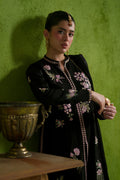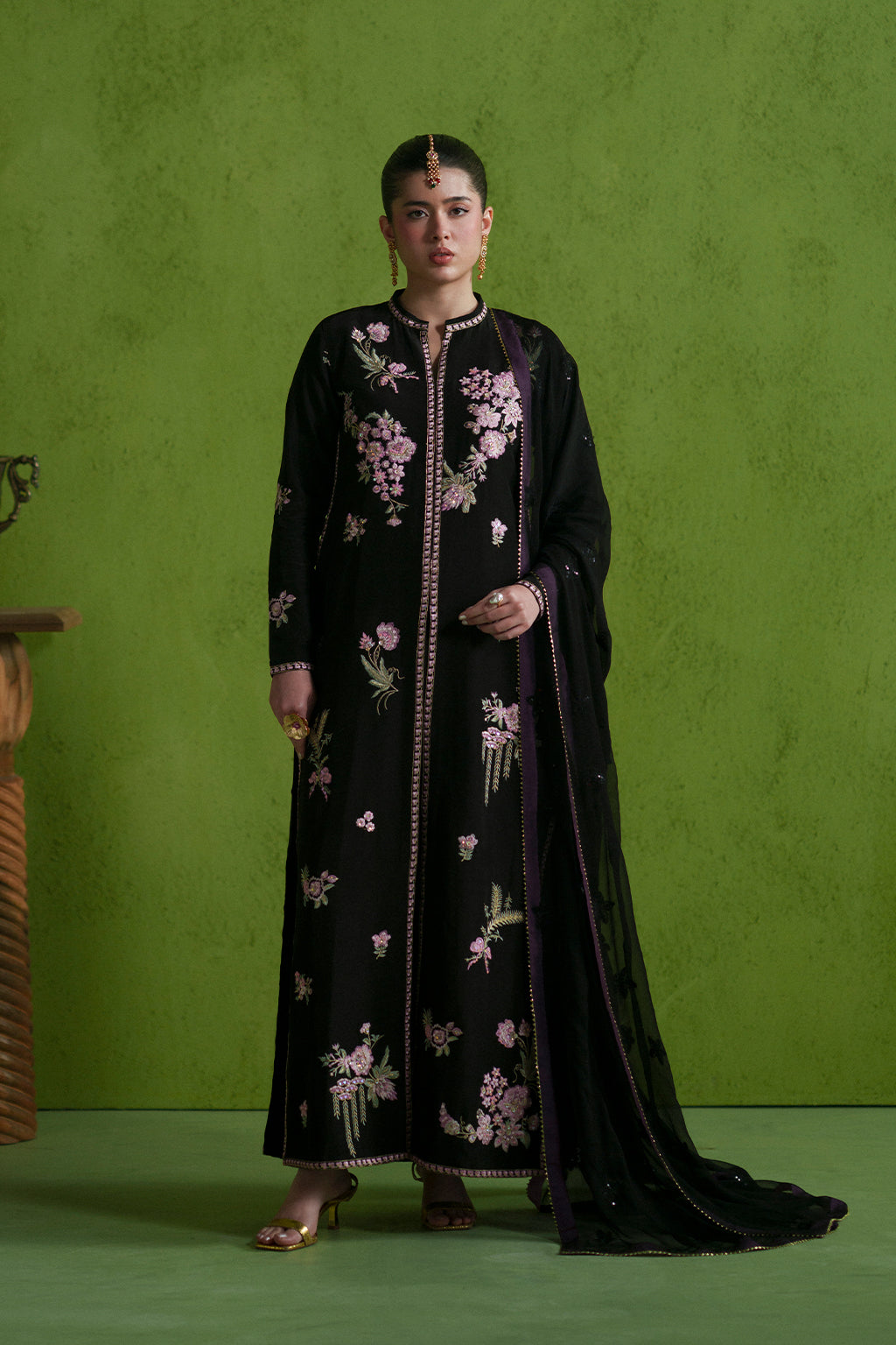 A delicate embroidered shirt intricately detailed with hand embellishments, paired with a flowing chiffon dupatta and plain trousers for a timeless, elegant look.
