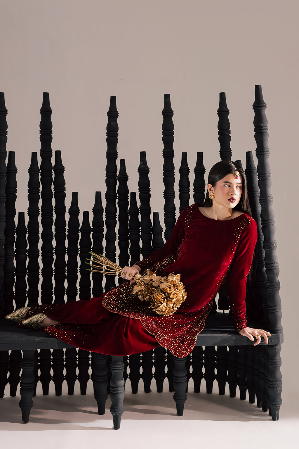 A premium red hand embellished stonework velvet shirt paired with hand embellished stone work farshi shalwar and chiffon dupatta