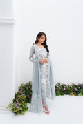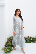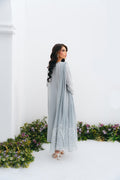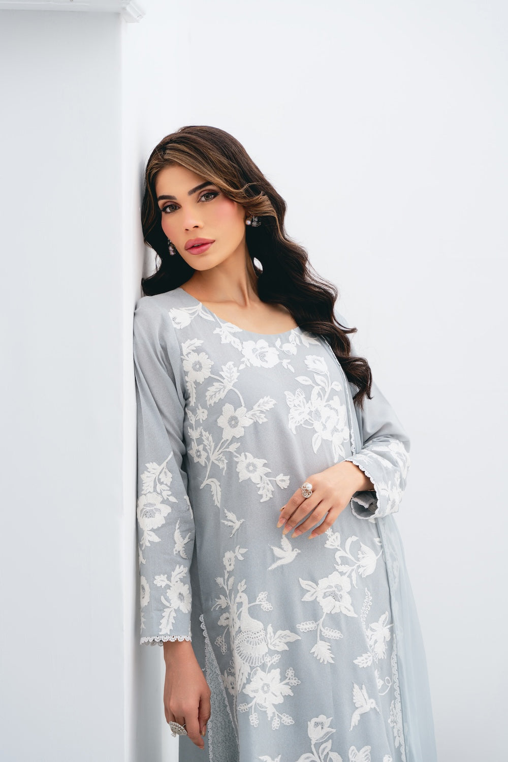 A modernised twist on the classic aari silhouette. This floral embroidered ensemble in monotone, finished with lace detailing is a statement piece for your summer affairs. It comes with a block-printed laced-up dupatta to complete the look. Style the look in a variety of ways.