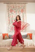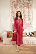 A traditional ensemble which is cut from pure rawsilk, with an intricately hand embellished neckline, panels and sleeves. Delicate embroidery adorn the shirt along with a delicate border on the sleeves. It comes with straight pure raw silk pants in the same hue. Alternatively, you can pair it with a pure kattan organza dupatta, adorned with elaborate embroidered border on all four sides, making this something that can be dressed up or dressed down according to the occasion.
