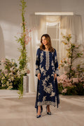 Immerse yourself in the enchanting allure of “Khwaab”, where a luxurious blue base is elegantly adorned with soft monotone and simmering embroidery, crafting a mesmerizing display of grace. Intricately detailed with an embroidered border, and sleek straight trousers, this stunning ensemble epitomizes high-end sophistication, perfect for adding a touch of opulence and ethereal beauty.