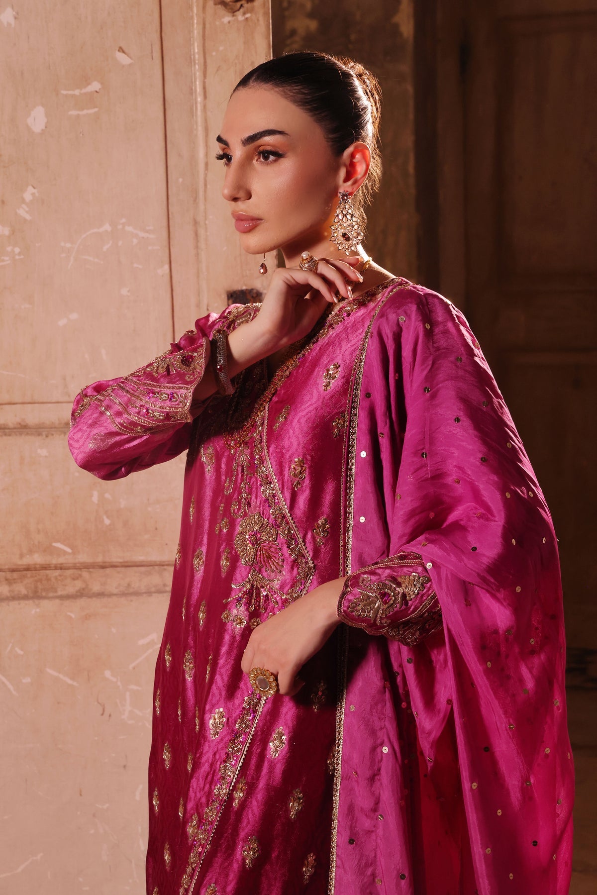 This magenta Angarkha shirt is made on embossed sheesha silk. The shirt is hand worked with kora, dabka, sequins, gota, resham and tilla work on front back and sleeves.