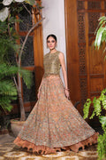Lehnga:Digital printed pure chiffon lehnga embellished with zari, gota, tilla and sheesha work, finished with a detailed hem.