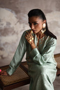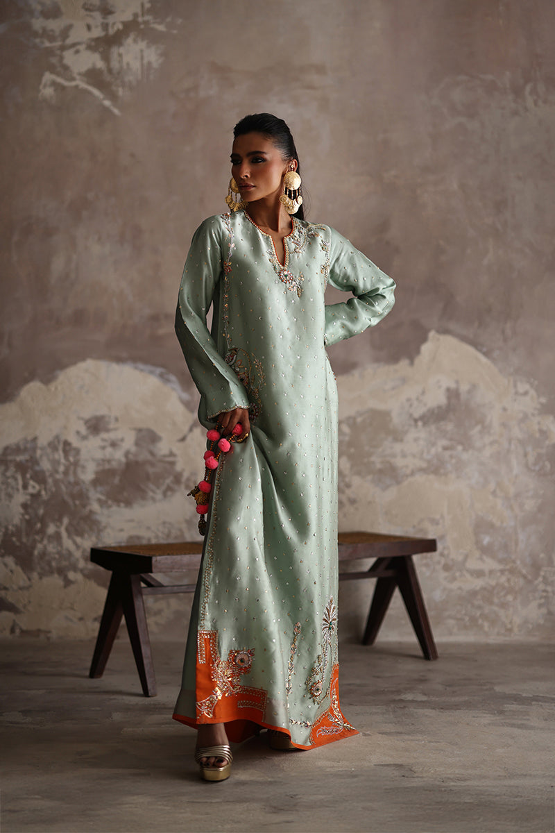 Make a statement in this exquisite Mint formal kaftan. A true ode to craftsmanship and luxury. Meticulously hand-embroidered with zardozi, Swarovski crystals, sequins, and stone work, it embodies refined opulence. Finished with our signature appliqué detailing, this masterpiece radiates timeless elegance with a modern, graceful charm.