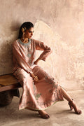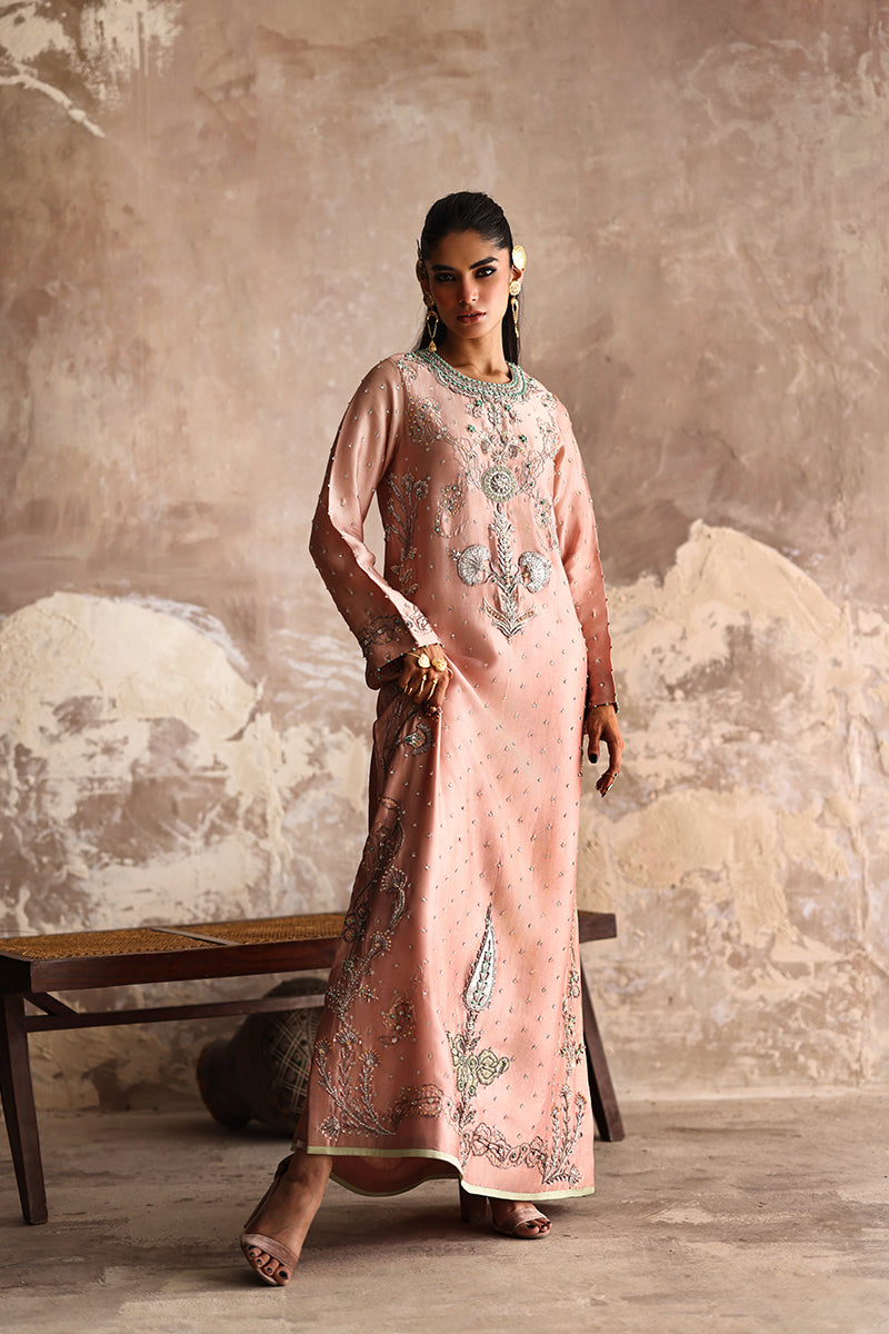 Make a statement in this exquisite blush pink formal kaftan A true ode to craftsmanship and luxury. Meticulously hand-embroidered with zardozi, Swarovski crystals, sequins, and stone work, it embodies refined opulence. Finished with our signature appliqué detailing, this masterpiece radiates timeless elegance with a modern, graceful charm.