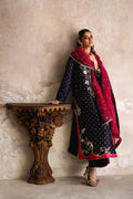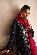 Radiating sophistication and craftsmanship, this formal Navy ensemble features a meticulously hand-embroidered long shirt adorned with zardozi, crystal and sequin work. Paired with a matching izaar and a hot pink pure organza dupatta, highlighted with delicate sequin work and block print borders. A perfect harmony of elegance, artistry, and timeless allure.