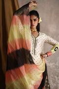 A timeless ensemble that blends heritage with refined modernity. Formal Premium Sheesha Silk Shirt in a beautiful Ivory shade, exquisitely hand-embroidered with zardozi and sequin work, finished with delicate kingri and loop accents. Paired with a foil-printed Izaar featuring appliqué motifs, and a pure organza lehria hand block printed Dupatta.