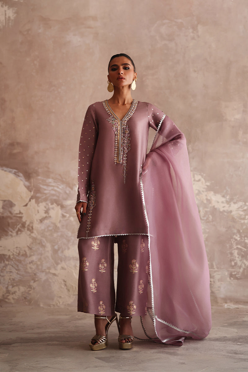 Immerse in understated luxury with this formal Lilac Shirt. Hand-embroidered to perfection with zardozi, crystal, and sequin artistry and finished with delicate kingri detailing. Paired with a hand block-printed izaar and a pure organza dupatta edged with kingri work. A celebration of craftsmanship, grace, and timeless sophistication.
