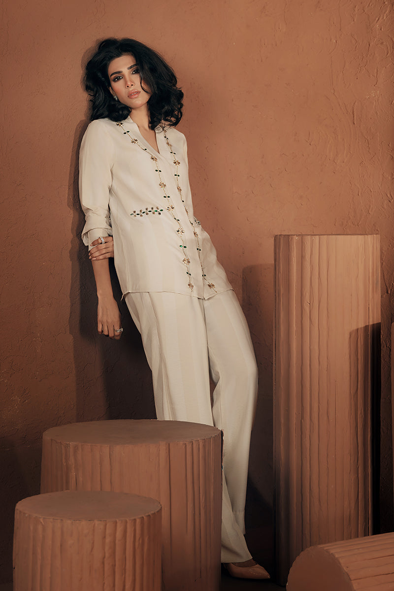 This chic printed coordinate beige is adorned with stone, crystal work, and chain detailing, bringing in a touch of sparkle to your everyday elegance. Paired with sleek pants for a look that’s polished, modern, and effortlessly stunning.