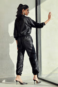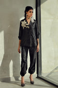 Formal black embossed silk co-ord set, intricately embroidered with swarovski crystals, pearls, chain-stone embellishment, cutwork collar & applique work. Paired with harem pants to complete the look.