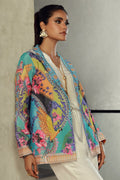 Formal digital printed jacket inspired by birds of paradise, featuring parrots, floral and geometric patterns in pastel hues with swarovski crystals, sequin & applique work.You may also add a white Korean silk jumpsuit to complete the look.