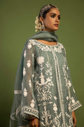 This beautiful front-open shirt is fully embroidered with formal aari work featuring turkish floral motifs. Paired with straight pants with lace detailing and formal organza dupatta with lace detailing.