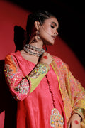 This beautiful Coral Pink Long Pishwas is adorned with formal hand embroidery of Resham Work, Zardose, Sequin, Swarovski Crystals, Bead Work and Applique work featuring floral motifs. Paired with matching Dhaka Pajama.