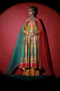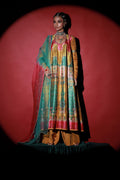This beautiful Digital Printed Long Pishwas in stunning combination of canary yellow, mint and pink features Mughal Architecture inspired custom print featuring Mughal Mehraab and Lotus Flower motifs. Adorned with formal hand embroidery with pearls, Swarovski crystals, sequin work, bead-work and intricate button detailing. Paired with Mustard Korean Silk Dhaka Pajama.