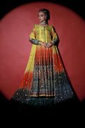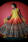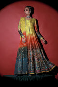 This beautiful Digital Printed Ombre effect Long Pishwas in stunning combination of Lime Green, Orange and Teal Green features Mughal Garden inspired custom print featuring Peacocks, Deers ad Floral Motifs. Adorned with formal hand embroidery of heavy pearls, Swarovski crystals, sequin work, bead-work and intricate buttons detailing. Paired with Teal Green Korean Silk Dhaka Pajama.