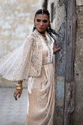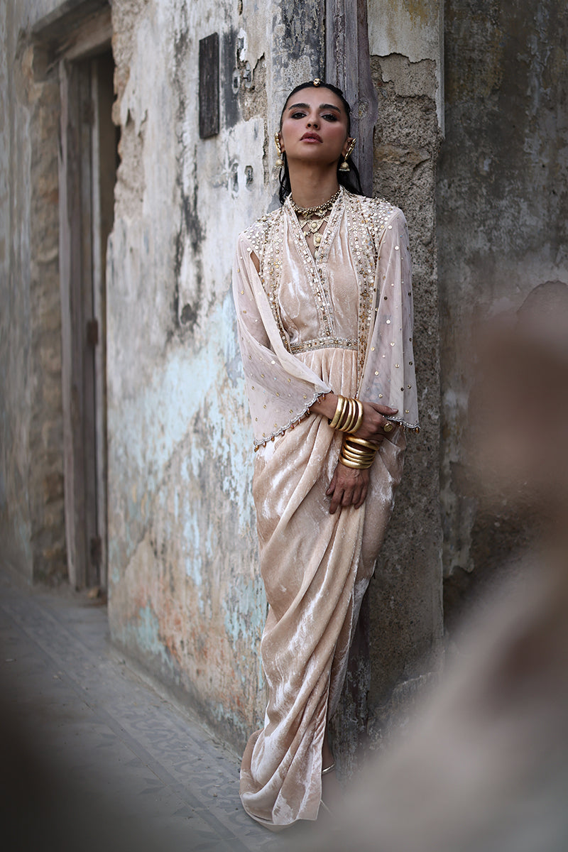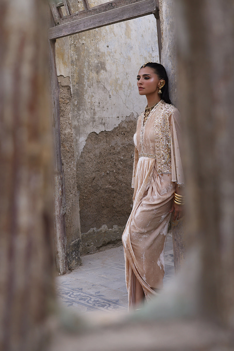 Make an unforgettable statement in this exquisite formal drape, handcrafted from two-toned pure velvet in a soft rose nude hue that exudes understated opulence. The velvet drape dress is paired with a formal net cape, meticulously hand-embroidered with intricate zardozi work, shimmering crystals, and delicate sequins, a true showcase of artisanal mastery.