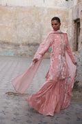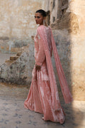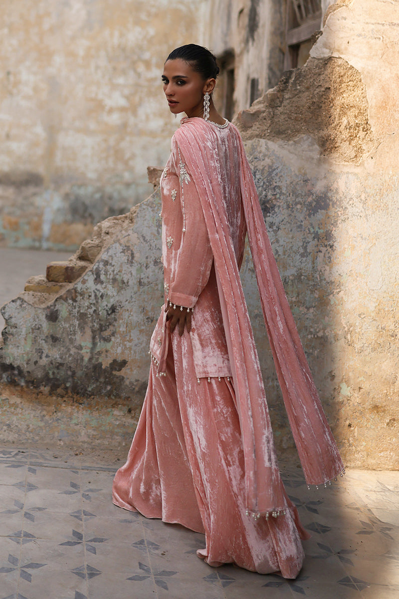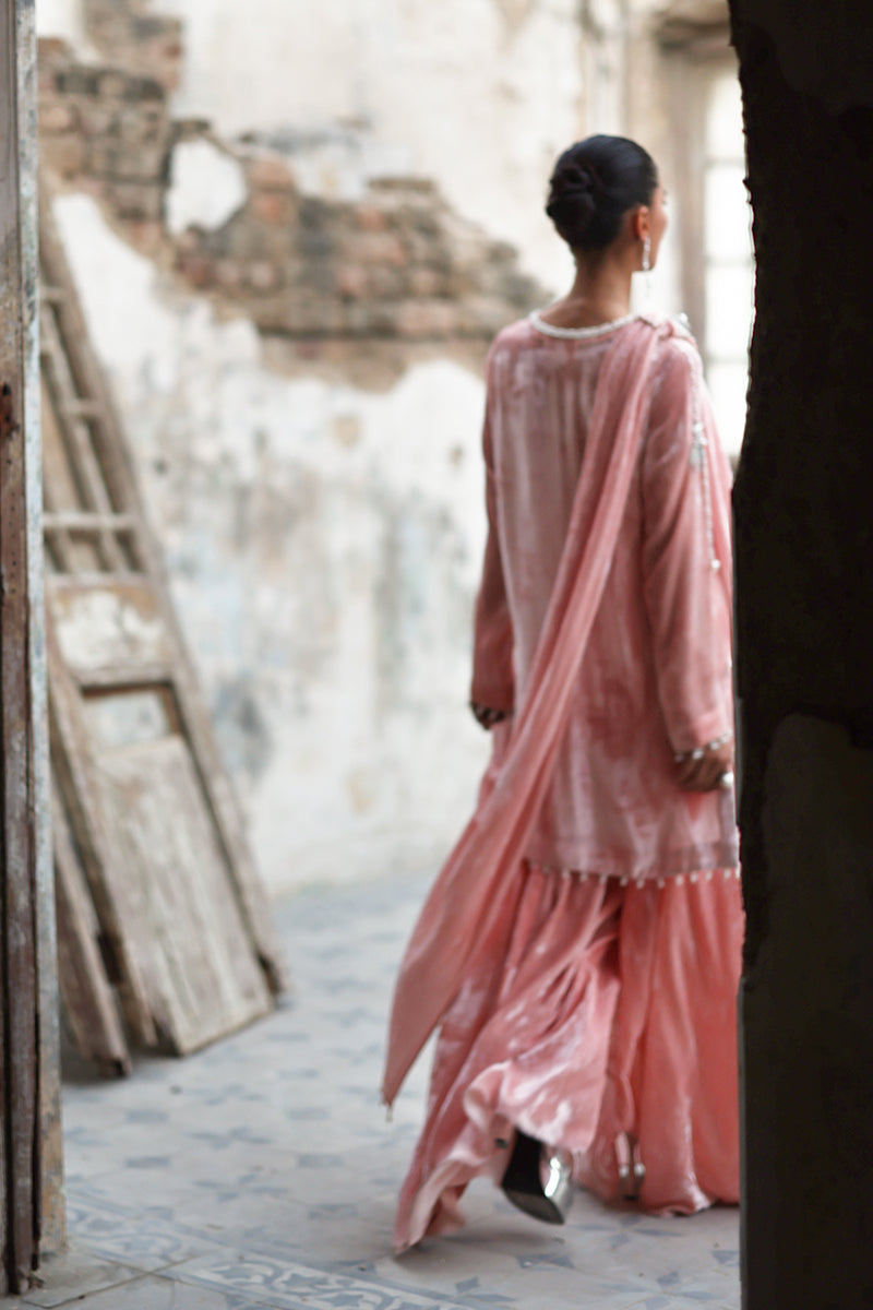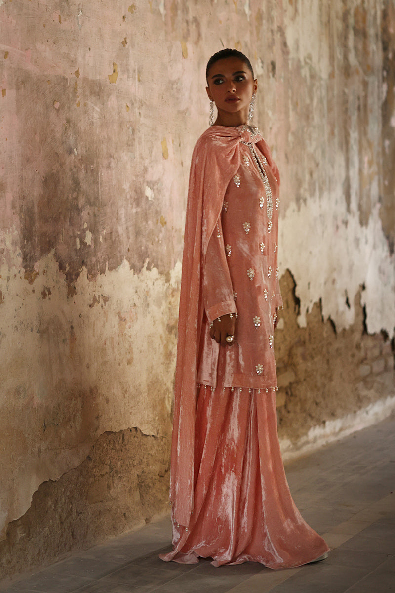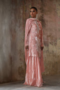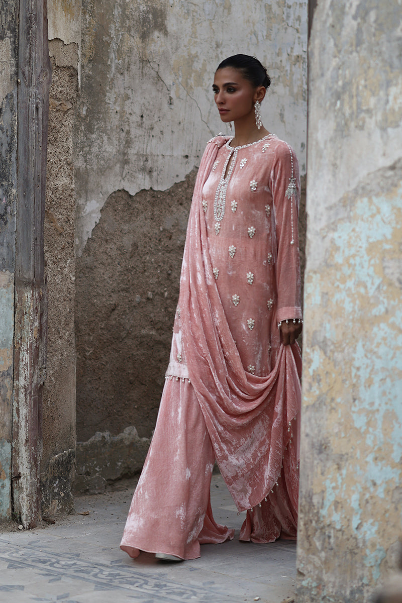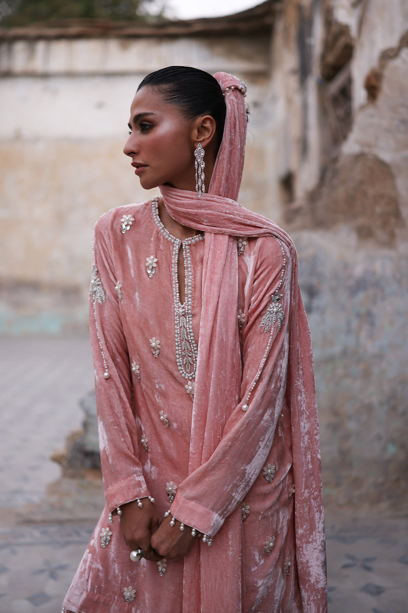 A celebration of intricate craftsmanship, this Pure Velvet ensemble in a beautiful Rose Quartz hue is beautifully hand-embroidered with zardozi, pearls, delicate pearl flowers, and shimmering Swarovski crystals, creating a look that’s both regal and refined.