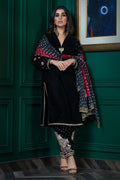 Formal Black Velvet Hand Embroidered Shirt with Resham, Zari and Zardoze Work. Paired with Heavy Hand Embroidered Velvet Shalwar with Signature Bird Motifs and Formal Silk Chunri Dupatta with Block-print and Bead Detailing.