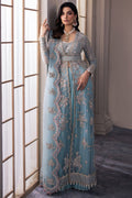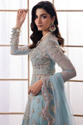 Step into the regal splendor of our 'Kiana' pishwas, a masterpiece draped in an ethereal ice blue. This stunning kalidar, a testament to Zaha's unrivaled artistry, features meticulously crafted panels adorned with dazzling sitaras, luminous milky stones, and intricate gotta work. Its crowning glory is the gossamer organza dupatta, delicately bordered with exquisite embroidery, adding an air of celestial elegance to the ensemble. 'Kiana' is more than just a garment; it is a celebration of timeless beauty, effortlessly merging classic heritage with modern sophistication.