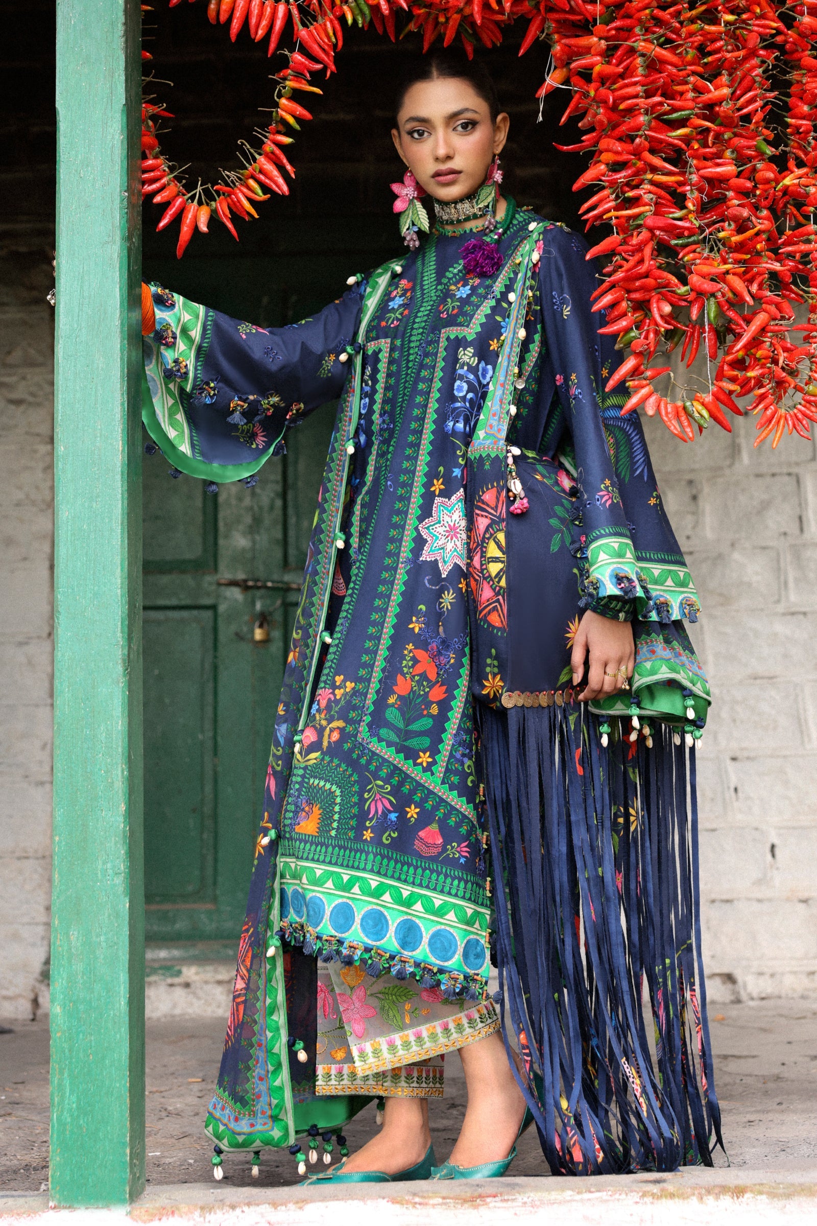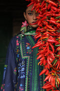 Midnight blue just got a playful upgrade! Amani is all about free-spirited charm, featuring whimsical oversized florals and intricate embroidery that add an artsy, vibrant touch. The breezy chiffon dupatta flows effortlessly, while contrasting ivory trousers with an embroidered patch and a statement back motif complete the look with a hint of quirk. Fresh, fierce, and fabulously boho—this is for the Zaha girl who loves to mix fun with flair!