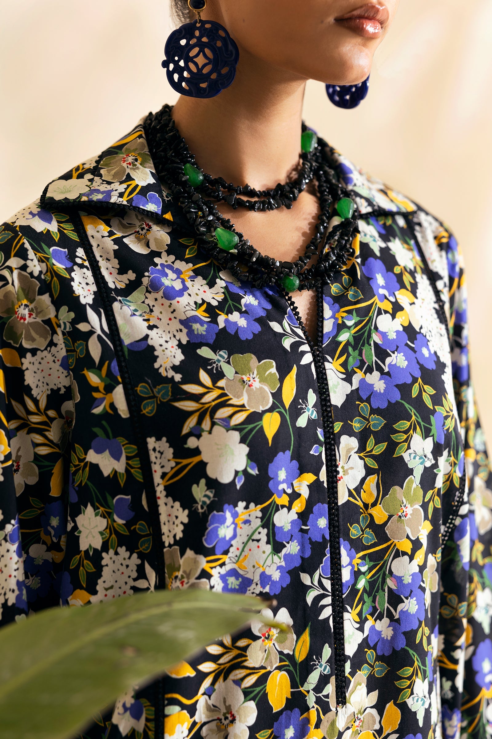 Soleo – A floral dream in motion, this black co-ord set is drenched in vivid jewel-toned blooms that flow seamlessly across the fabric, creating a striking yet effortless allure. The continuous print adds movement, making every detail feel fluid and captivating.