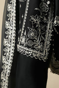 An enigmatic shade of ebony forms the canvas for Noctis, where moonlit geometry and delicate florals entwine in a dance of light and shadow. Lustrous ivory threads trace graceful patterns across the raw silk, as butterflies drift like fleeting dreams through the night sky. The look is completed with an ethereal organza dupatta, intricately embroidered in soft florals, and a tonal tapered shalwar finished with refined stitch detailing. Enigmatic, elegant, and endlessly captivating — Noctis embodies the poetry of twilight, where silk shimmers like starlight and every detail whispers quiet luxury.