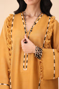 Step into winter radiance with Soleia, a trendy mustard shalwar kameez that effortlessly blends elegance with edge. Intricate beige and chocolate brown embroidery delicately frames the neckline and shirt, adding a luxurious touch of sophistication