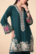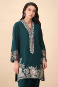 Verdance – Turn heads with this ultra-chic dark green short shirt, featuring a trendy round hem and paired with a stylish shalwar for a modern, effortless vibe. Intricate blooming floral embroidery along the hem and a beautifully crafted neckline with pops of maroon, mustard, and sage elevate this look with a touch of sophistication.