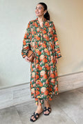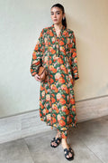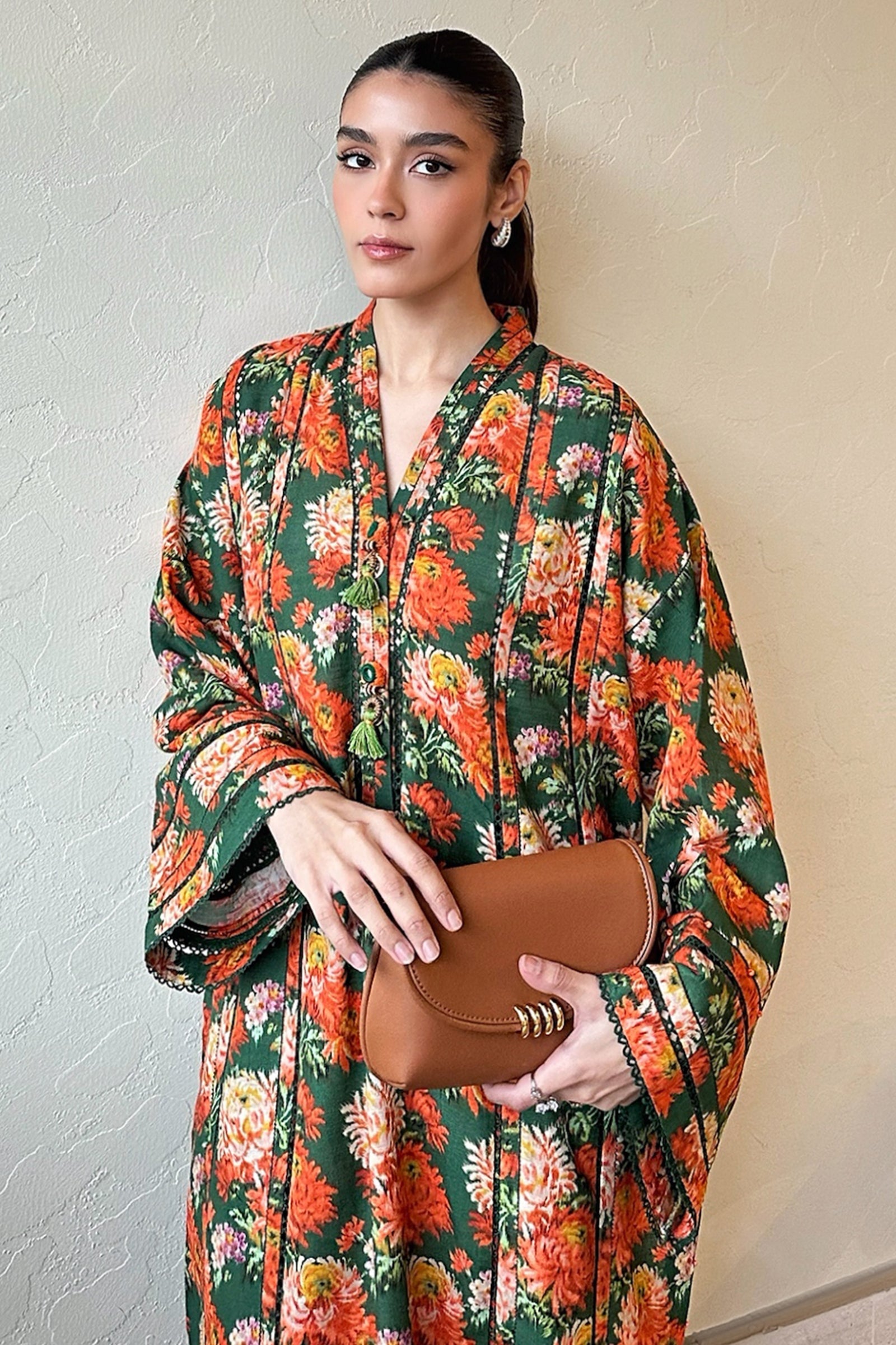 Introducing "Ember Glow", a cozy yet luxurious two-piece khaddar ensemble that perfectly captures the essence of winter. The deep emerald green base provides a rich, comforting foundation, while the striking digital print of fiery orange marigold flowers adds a vibrant warmth, making it the ideal choice for chilly winter brunches.