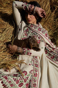 AABROO is a celestial-inspired winter treasure, wrapped in the soft glow of a creamy winter hue. Its intricate embroidery radiates a cozy warmth, with each stitch paying homage to timeless craftsmanship, weaving a story rich in heritage. Ethnic florals, delicately crafted in deep, sumptuous red and garnet, blossom across the ensemble, adding an enchanting layer of warmth and charm that feels both grounded in tradition and touched by stardust. Completing this ethereal winter look is a plush karandi shawl, elegantly bordered in contrasting tones that evoke opulence and magic, perfectly capturing the serene beauty of a winter's day.