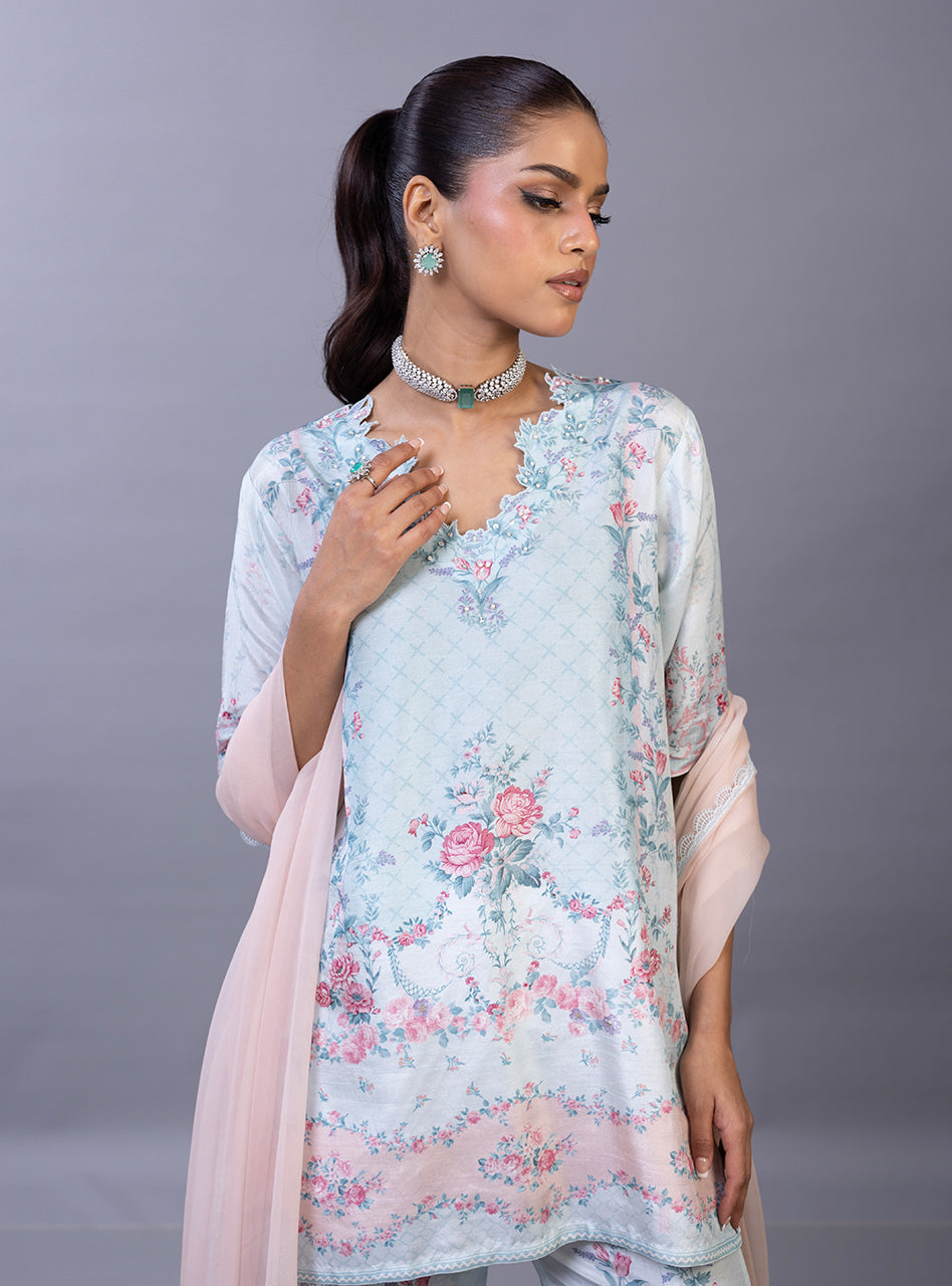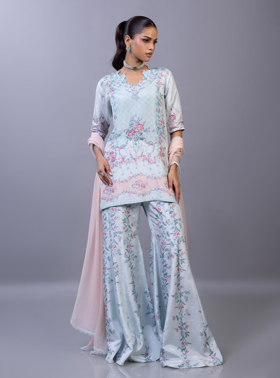 This stunning three-piece ensemble is a masterclass in contemporary luxury, featuring a short-length shirt and dramatic flared pants meticulously crafted from pure raw silk for a rich, lustrous finish. The outfit is drenched in an ethereal pastel palette, showcasing a delicate floral and botanical print in soft shades of powder blue and rose pink. A standout feature is the laser-cut scalloped neckline, which provides a high- end, artisanal touch to the modern silhouette. Completed with a lightweight blush pink chiffon dupatta finished with a dainty lace trim.