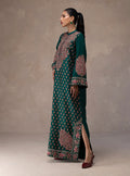 Make a grand entrance in Emerald Muse, a masterpiece of traditional aesthetic and modern luxury. Set against a deep, lustrous forest green canvas, this ensemble features an intensely detailed embroidered "gala" in shades of rose and pearl. The Kaftan is adorned with an all-over patterned motif, leading to a sprawling botanical border that adds weight and grace to the silhouette.