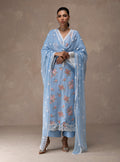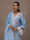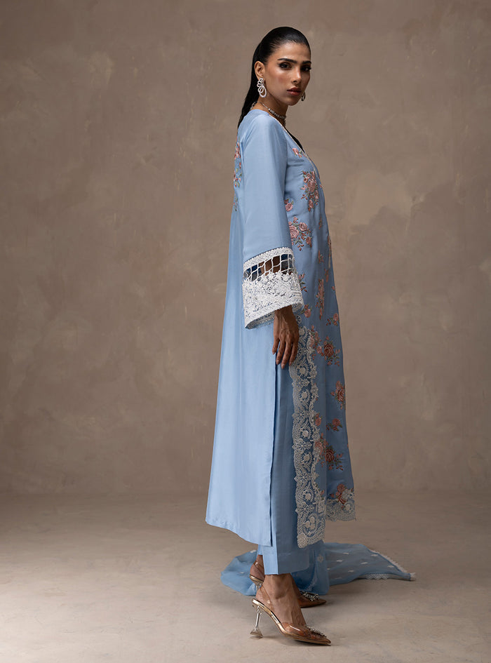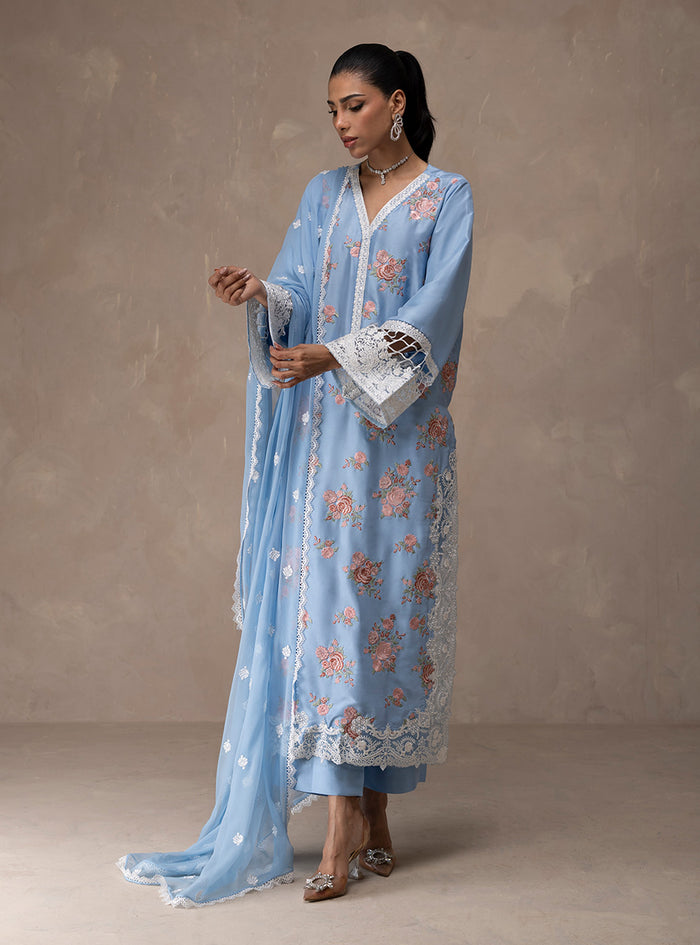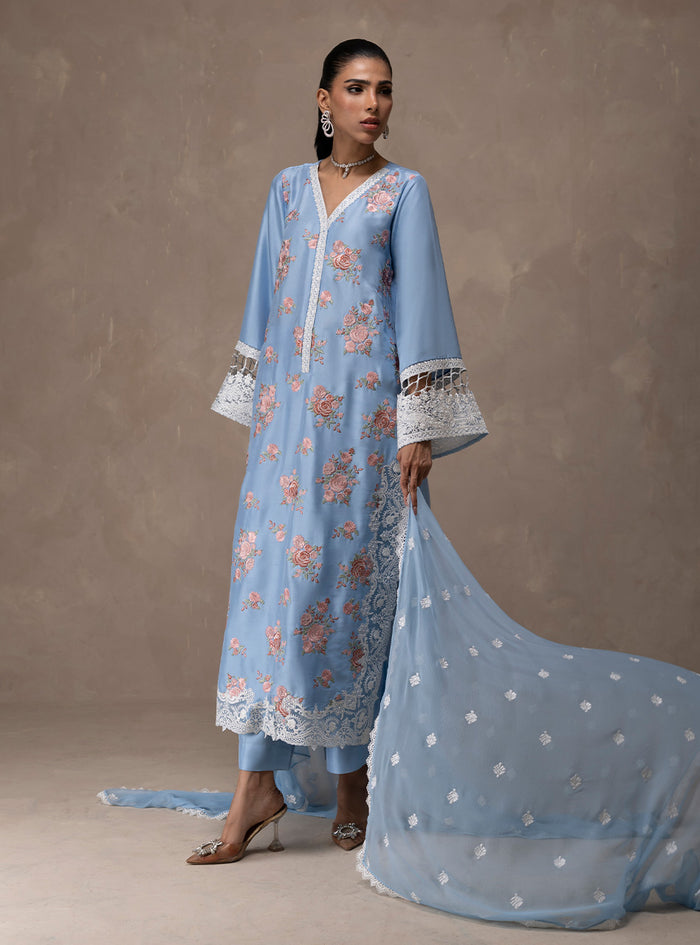 Refresh your Eid look with Flora Ice, a stunning three-piece suit designed for effortless elegance. The breezy ice blue raw Silk features delicate floral bunches in warm sunset hues, perfectly balanced by intricate white embroidered applique on the daman. Light, airy, and exquisitely detailed, it comes with sleek Silk trousers and a dupatta that flows with every step. It's the perfect choice for a sophisticated daytime celebration.