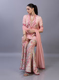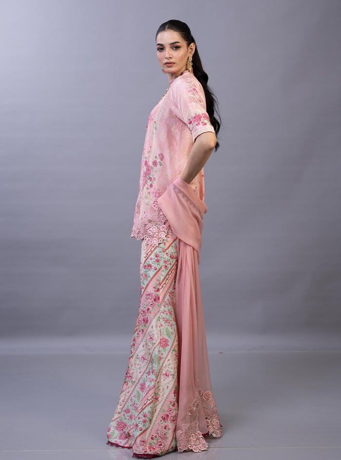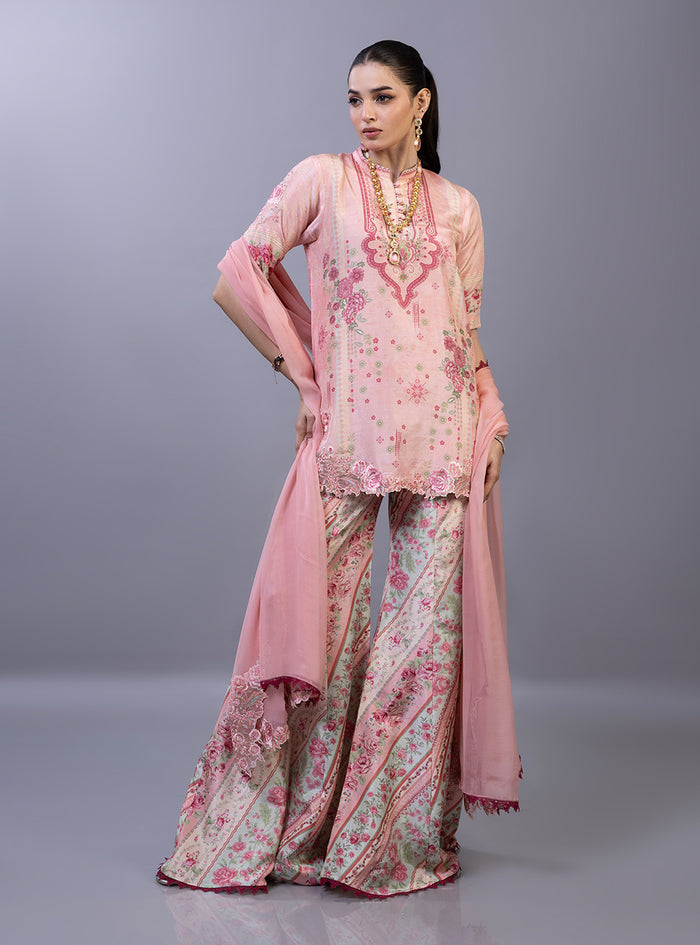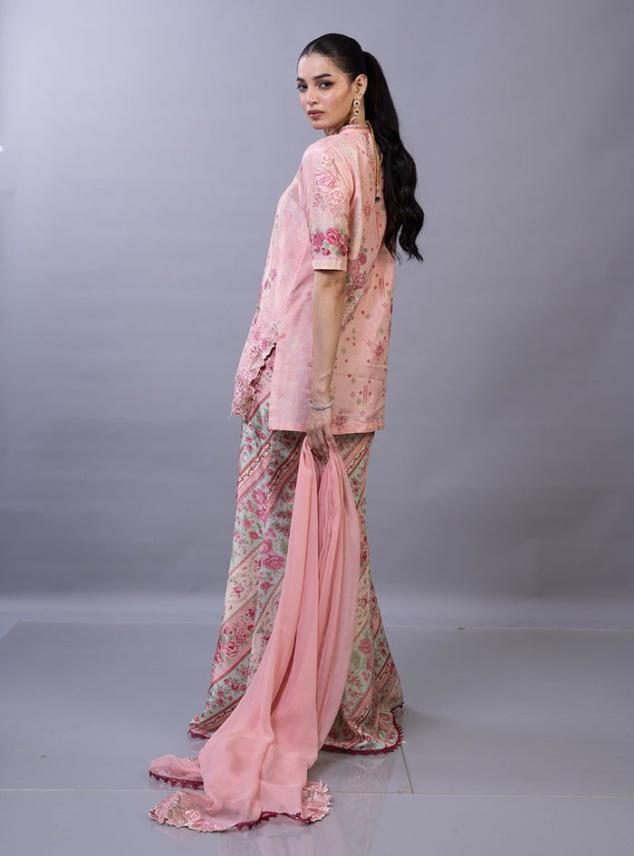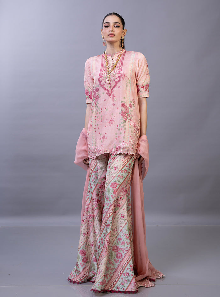 This exquisite ensemble is a masterclass in contemporary luxury, featuring a short-length shirt meticulously crafted from pure raw silk. The shirt is adorned with a delicate botanical print in ethereal shades of blush pink and sky blue, complemented by a scalloped, hand-embroidered hemline that adds a layer of artisanal texture. It is paired with striking flared pants in a coordinating floral pattern. Completing the look is a lightweight, monochromatic chiffon dupatta that adds an airy, romantic finish to the pastel palette.