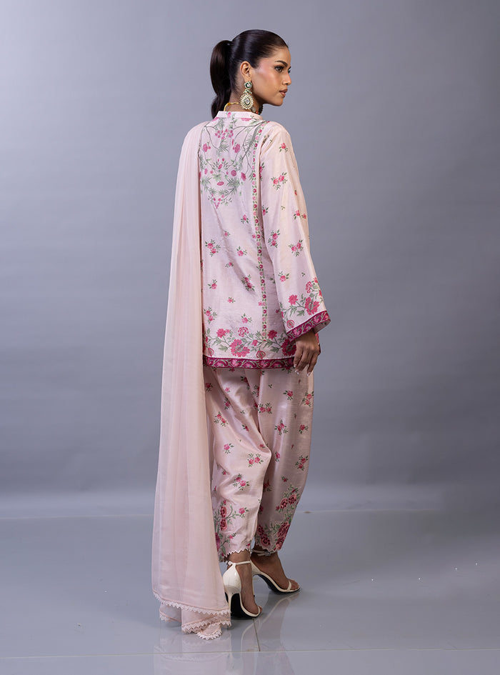 This sophisticated three-piece ensemble featuring a meticulously tailored shirt and shalwar set crafted from pure raw silk for a premium, lustrous finish. The outfit is immersed in a soft, romantic blush pink palette, adorned with an intricate floral print that showcases delicate climbing floral vines and blooming roses in shades of crimson and sage green. The shirt’s sleek silhouette is echoed in the tapered shalwar, which features a beautifully detailed floral border at the hem, creating a cohesive and high-end look. Completing the attire is a flowing, tonal chiffon dupatta that drapes with effortless elegance, finished with a dainty lace trim and scattered floral motifs.