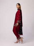 Ilaya, This beautiful three-piece outfit features a deep maroon raw silk short shirt with embroidery on the front, including a detailed V-neckline, embroidered sleeves, and a prominent hem design. It is paired with comfortable shalwar that have matching embroidered cuffs. The ensemble is completed with a black chiffon dupatta adorned with scattered embroidery, creating a sophisticated, stylish, and elegant look.