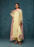 Vaani is a captivating ensemble crafted from exquisite lemon-yellow raw silk. Its luminous canvas is brought to life by a medley of delicate pink and green floral embroidery, blossoming across the front and back. The charming V-neckline, adorned with subtle buttons, and the gracefully flared, embroidered sleeves add a touch of refined elegance. Paired with a flowing peach chiffon dupatta, intricately detailed with matching blooms, this outfit is an ode to delicate luxury and effortless grace.
