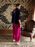 A sophisticated, high-fashion fusion ensemble perfect for making a bold statement. This striking piece features a tailored Deep Navy Blue velvet blazer jacket, designed with a sharp lapel and a subtle floral thread-work motif across the back for an unexpected touch of artistry. The modern tailoring beautifully contrasts with the traditional Magenta shalwar, which is richly adorned with intricate embroidery, showcasing a vibrant, festive energy.