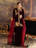 A magnificent ensemble that embodies festive grandeur. Crafted from sumptuously rich Maroon velvet, the exquisite short kurta is adorned with intricate gold tilla embroidery, forming an elaborate motif across the front and a breathtaking, sprawling design on the back. It is impeccably paired with matching flared velvet trousers, creating a sophisticated silhouette with a modern edge. The ensemble is completed by a sheer crimson organza dupatta.