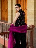 Keir vest and pants, a powerful, modern three-piece ensemble crafted from sumptuously soft black velvet. The tailored, sleeveless vest (koti style) features intricate floral thread-work embroidery in vibrant magenta and deep pink, adorning both the front and back for a luxurious finish. This dramatic look is completed by high- waisted, wide-leg velvet trousers that create a flattering silhouette, and a embroidered magenta dupatta with a velvet border that adds a bold pop of colour.