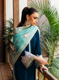 An ethereal and elegant three-piece suit in deep Teal Velvet. The shirt features heavy antique silver and gold thread-work embroidery concentrated on the hemline and wide cuffs. Paired with matching raw silk trousers and a stunning Aqua/Mint Organza Dupatta, which offers a refreshing contrast with its sprawling floral work and heavily detailed silver border.