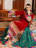 A luxurious three-piece in warm Rust Red Velvet. The shirt features a richly detailed multicolored embroidery on the neckline and a broad, intricate hem border in a medley of traditional colors. Paired with coordinating raw silk trousers and a breathtaking Turquoise Organza Dupatta with embroidered motifs and a lively border.